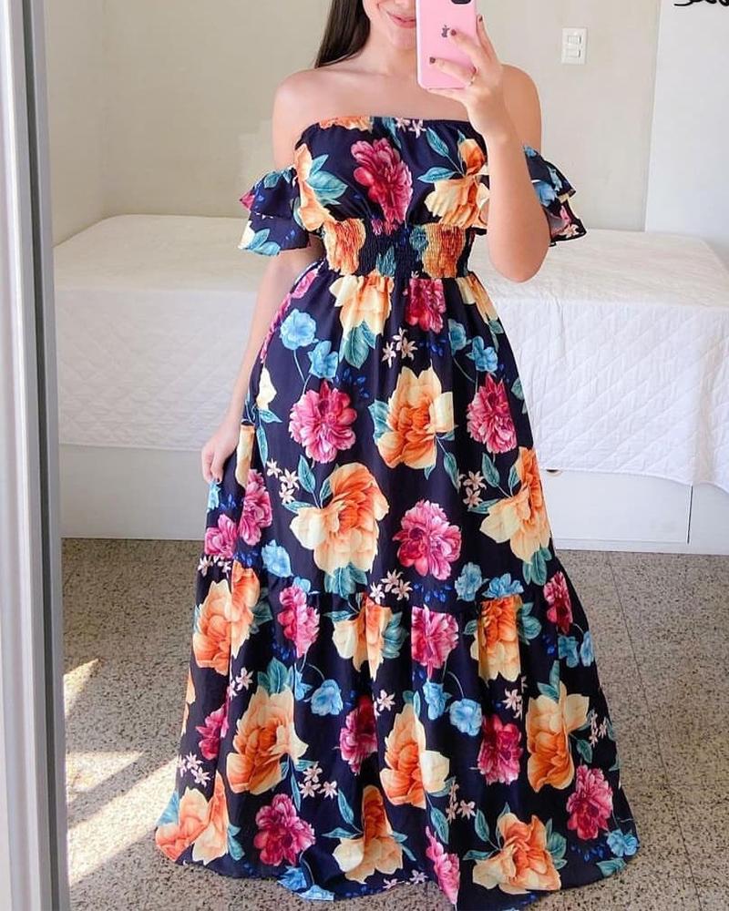 Style:Casual,Chic Type:A Line Material:Polyester Neckline:Off the Shoulder Sleeve Style:Short Sleeve Length:Maxi Pattern Type:Floral Decoration:Shirred Fit Type:Oversized Occasion:Daily,Vacation Package Include:1* Dress