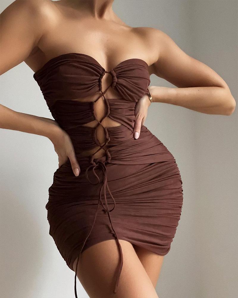 Style:Chic,Sexy Type:Bodycon Material:95%Polyester,5%Elastane Neckline:Bandeau Sleeve Style:Sleeveless Length:Mini Pattern Type:Plain Decoration:Ruched,Lace-up Fit Type:Skinny Occasion:Daily,Night Out Package Include:1* Dress