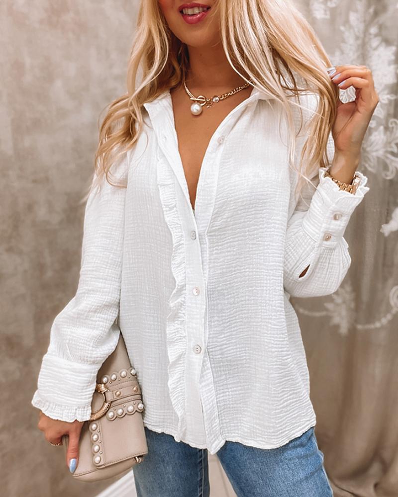 Style:Casual,Chic Type:Shirt Material:Cotton Blends Neckline:Turn-down Collar Sleeve Style:Long Sleeve Length:Regular Pattern Type:Plain Decoration:Button,Frill Hem Fit Type:Regular Occasion:Daily Package Include:1*Shirt