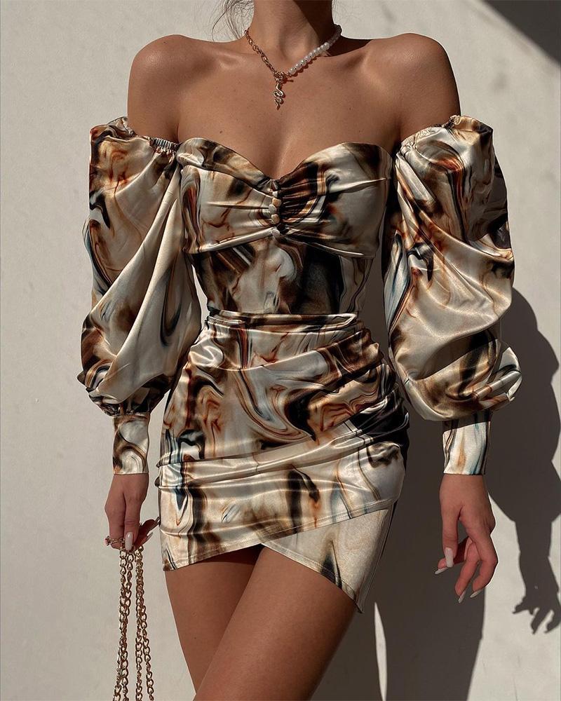 Style:Chic,Sexy Type:Bodycon Material:Polyester Neckline:Off the Shoulder Sleeve Style:Lantern Sleeve,Long Sleeve Length:Mini Pattern Type:Marble Decoration:Lantern Sleeve,Ruched Fit Type:Skinny Occasion:Daily Package Include:1* Dress