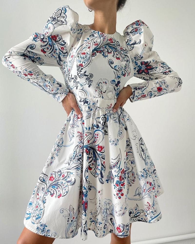 Style:Chic Type:A Line Material:Polyester Neckline:O-neck Sleeve Style:Long Sleeve,Puff Sleeve Length:Mini Pattern Type:Floral Decoration:Puff Sleeve Fit Type:Regular Occasion:Daily Package Include:1* Dress