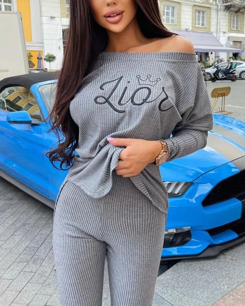 Letter Embroidery Ribbed Top & Pants Set