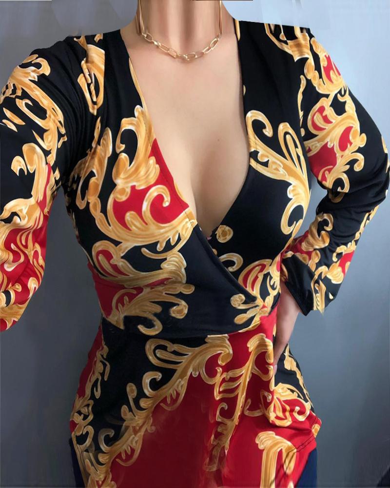 Style:Chic,Sexy Type:Tee Material:Polyester Neckline:V-Neck Sleeve Style:Long Sleeve Length:Regular Pattern Type:Baroque Fit Type:Regular Occasion:Daily Package Include:1*T-Shirt