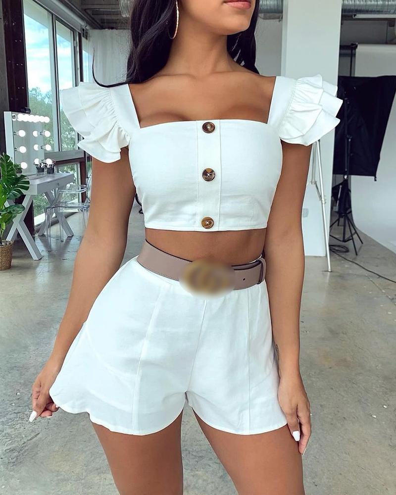 Button Decor Flutter Sleeve Crop Top & Shorts Set