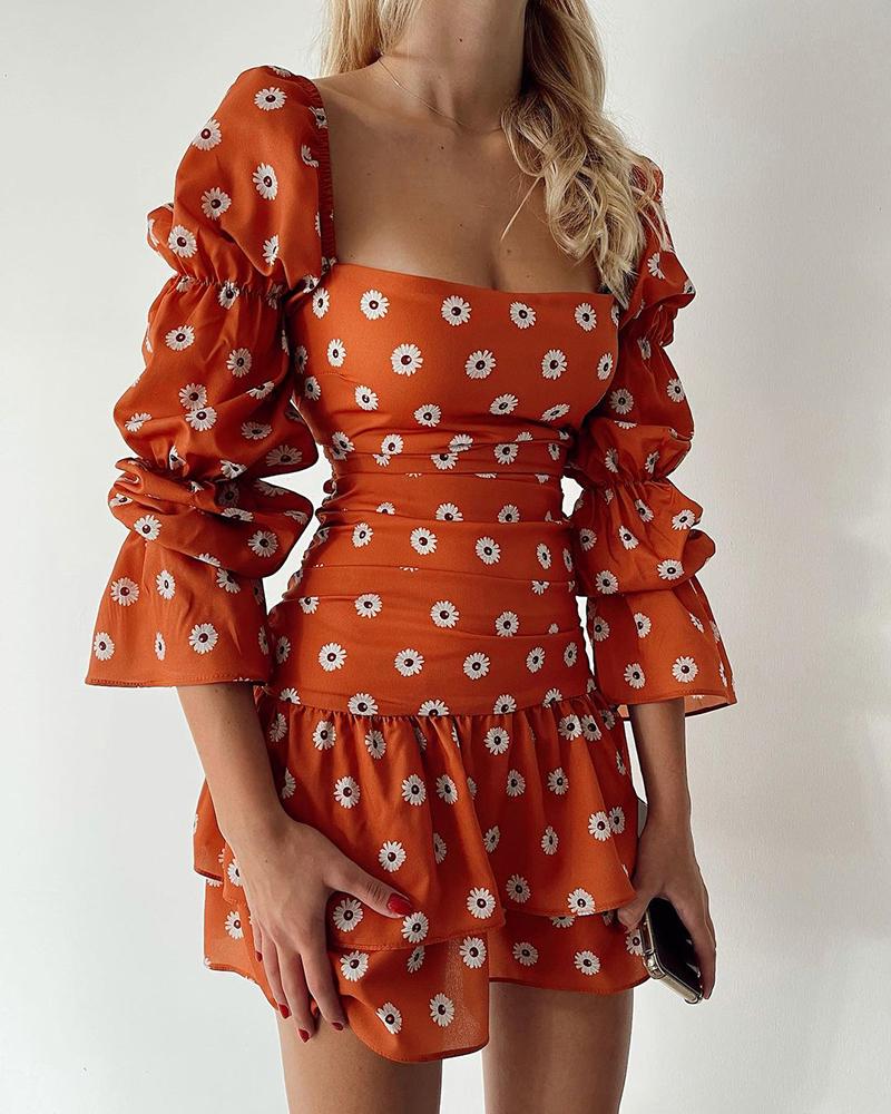 Style:Chic Type:A Line Material:100%Polyester Neckline:Square Neck Sleeve Style:Long Sleeve,Puff Sleeve Length:Mini Pattern Type:Daisy Decoration:Puff Sleeve Fit Type:Regular Occasion:Daily Package Include:1* Dress
