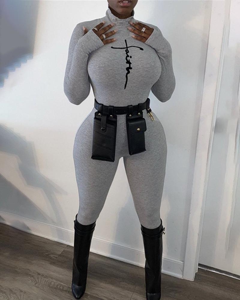 Letter Print High Neck Long Sleeve Skinny Jumpsuit
