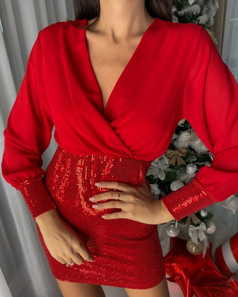 Style:Chic,Sexy Type:Pencil Material:Sequin,Mesh Neckline:V-Neck Sleeve Style:Long Sleeve Length:Mini Pattern Type:Plain Decoration:Contrast Sequin Fit Type:Regular Occasion:Night Out,Party Package Include:1* Dress