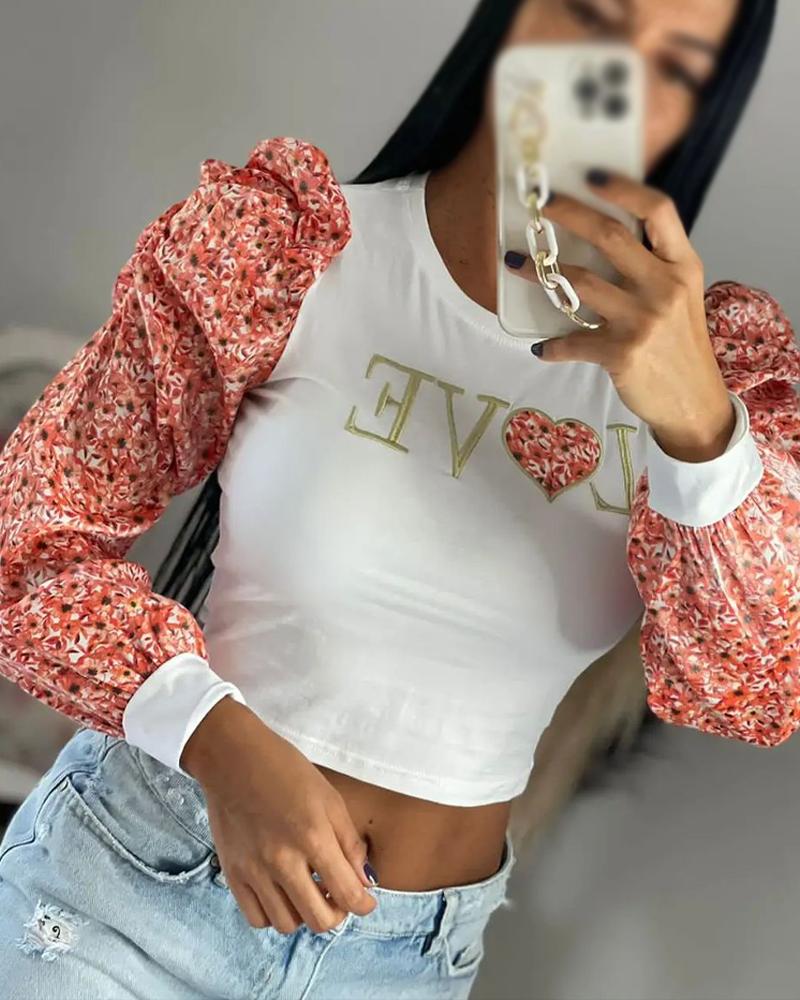 Style:Chic,Sexy Type:Blouses Material:Polyester Neckline:Round Neck Sleeve Style:Long Sleeve,Puff Sleeve Length:Crop Pattern Type:Ditsy Floral,Heart,Letter Decoration:Embroidery,Puff Sleeve Fit Type:Regular Occasion:Daily Package Include:1* Blouse