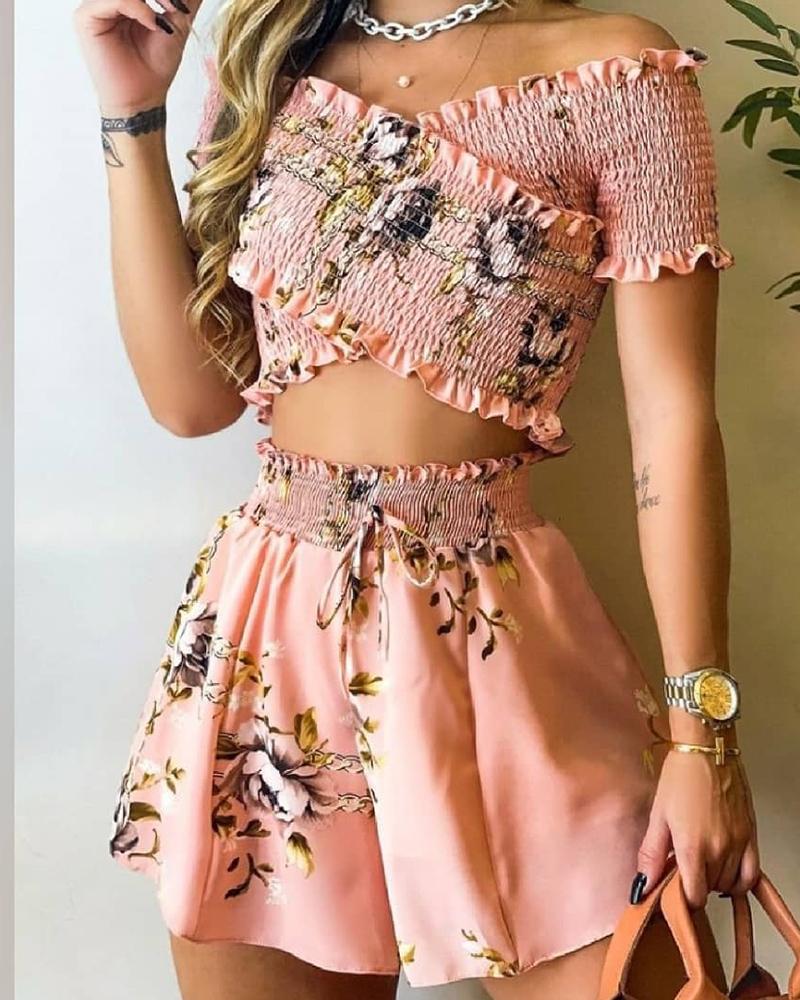 Style:Casual,Chic Type:Shorts Set Material:97%Polyester,3%Elastane Neckline:Off the Shoulder Sleeve Style:Short Sleeve Length:Above Knee Pattern Type:Floral Decoration:Frill Hem,Shirred Fit Type:Regular Occasion:Daily Package Include:Shorts Set