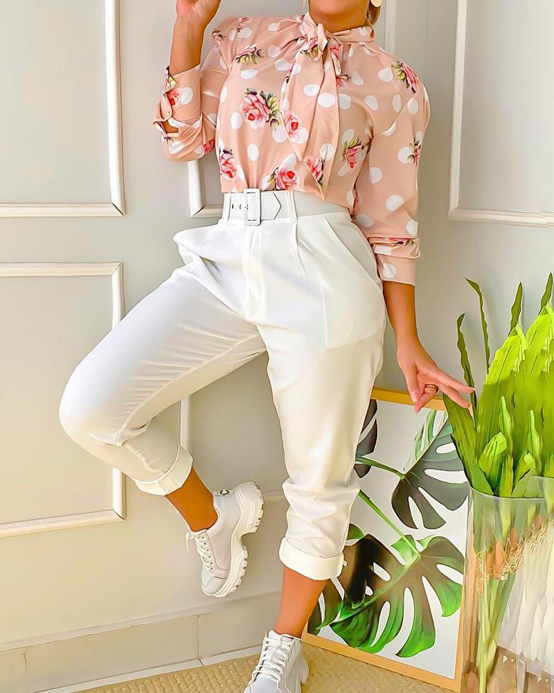 Style:Chic,Elegant Type:Pants Sets Material:Polyester Neckline:O-neck Sleeve Style:Long Sleeve Length:Long Pattern Type:Floral,Polka Dot Decoration:Pocket,Tied Detail Fit Type:Regular With Belt:Yes Occasion:Daily,Work Package Include:Pants Sets(With Belt)