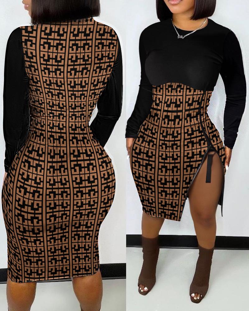 Style:Chic Type:Bodycon Material:95%Polyester,5%Elastane Neckline:O-neck Sleeve Style:Long Sleeve Length:Midi Pattern Type:Geometric Decoration:Zipper Fit Type:Skinny Occasion:Daily Package Include:1* Dress