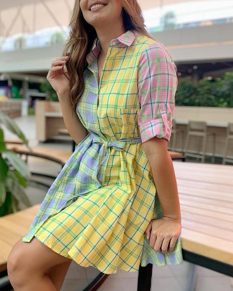 Plaid Print Colorblock Half Sleeve Shirt Dress