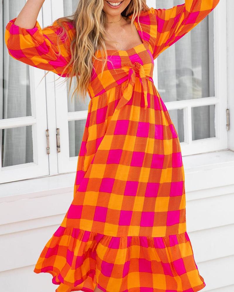 Plaid Print Colorblock Puff Sleeve Ruffles Casual Dress