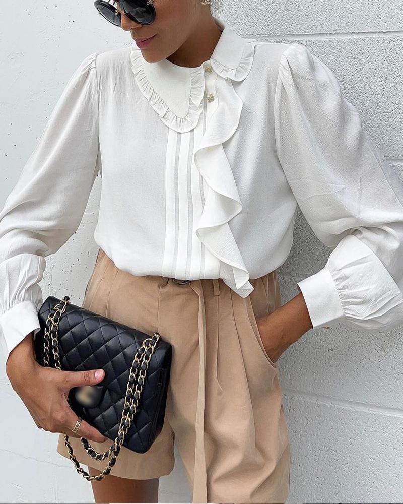 Style:Chic Type:Shirt Material:Polyester Neckline:O-neck Sleeve Style:Lantern Sleeve Length:Regular Pattern Type:Plain Decoration:Ruffles Fit Type:Regular Occasion:Daily Package Include:1*Shirt