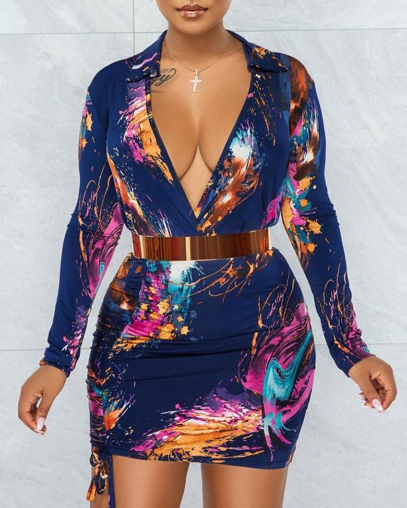 Style:Chic Type:Bodycon Material:Polyester Neckline:Plunge,Turn-down Collar Sleeve Style:Long Sleeve Length:Mini Pattern Type:Ink Splash Decoration:Drawstring Fit Type:Skinny Occasion:Party,Night Out Package Include:1*Dress