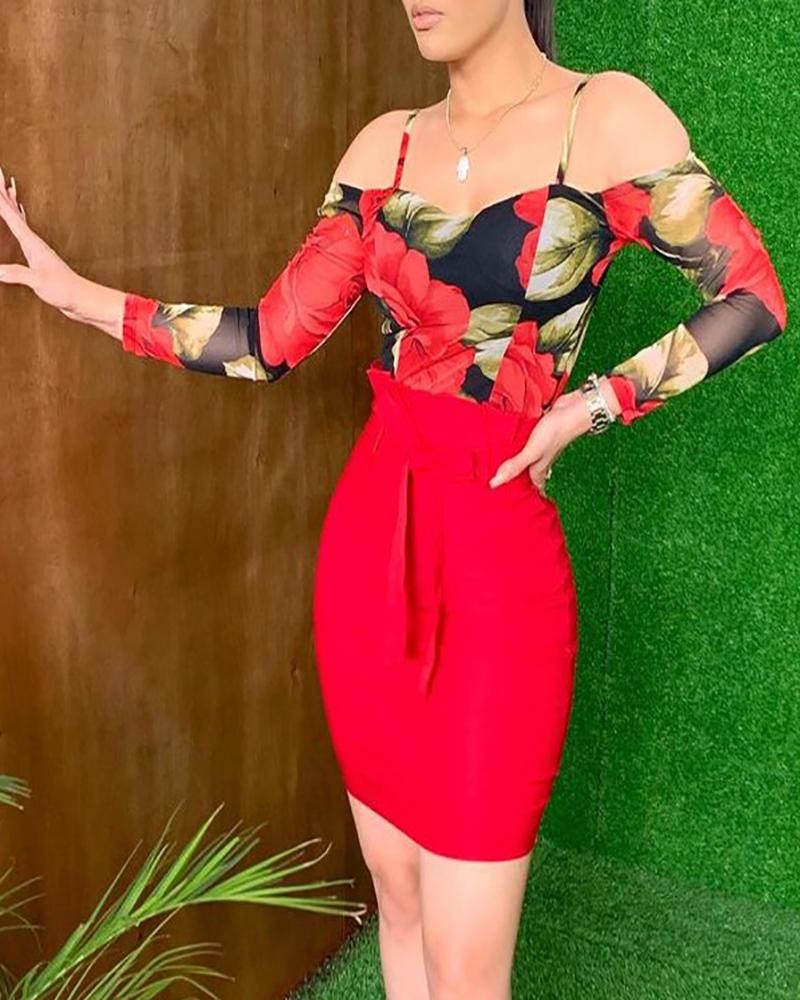 Cold Shoulder Floral Print Top & Paperbag Waist Skirt Set
