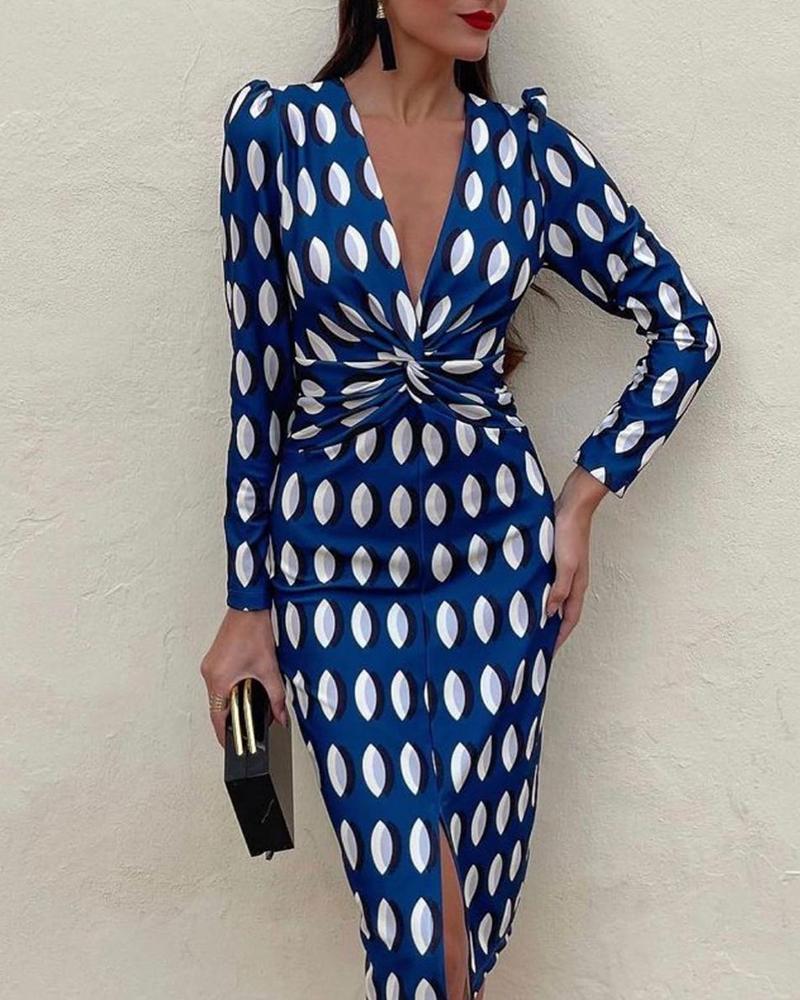 Style:Chic,Elegant Type:Straight Material:95%Polyester,5%Elastane Neckline:Plunge Sleeve Style:Long Sleeve,Puff Sleeve Length:Maxi Pattern Type:All Over Print Decoration:Backless,Puff Sleeve,Slit Fit Type:Regular Occasion:Daily,Work Package Include:1* Dress