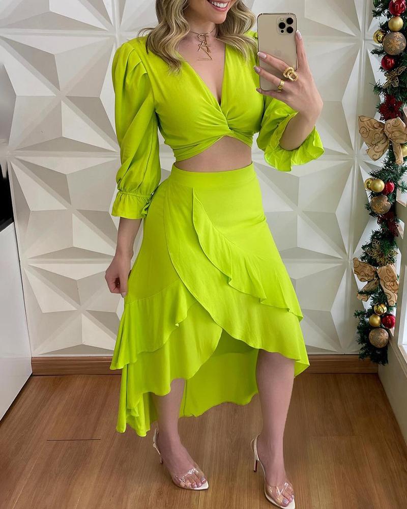 Style:Sexy Type:Skirt Sets Material:97%Polyester,3%Elastane Neckline:V-Neck Sleeve Style:Puff Sleeve,Bell Sleeve,Three Quarters Length:Asymmetrical Pattern Type:Plain Decoration:Frill Hem,Tied Detail,Puff Sleeve,Bell Sleeve Fit Type:Regular Occasion:Daily Package Include:1*Skirt Set