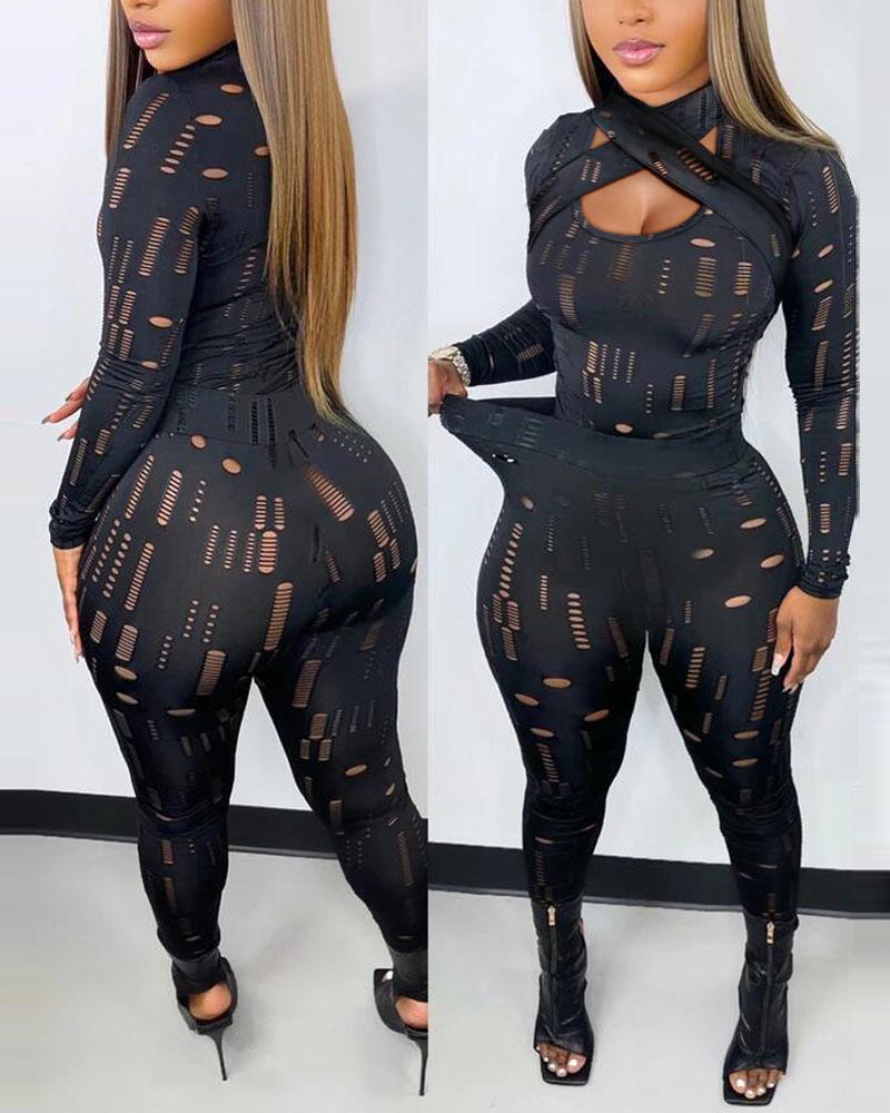 Hollow Out Criss Cross Long Sleeve Top & Pants Set