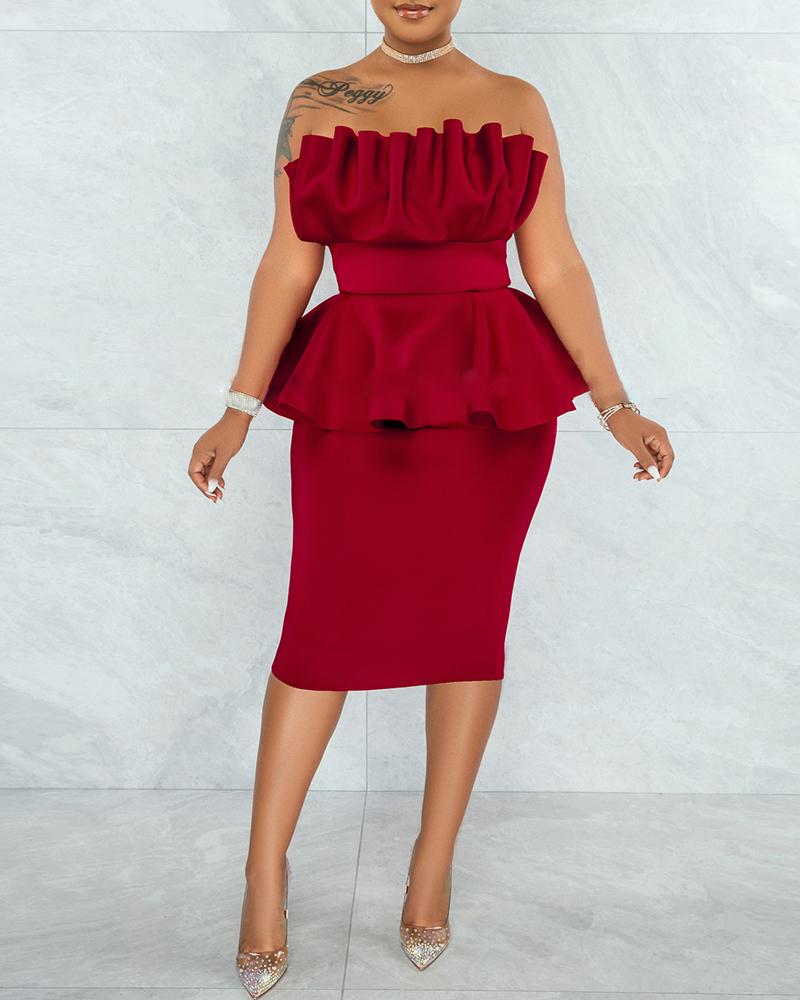 Style:Chic Type:Bodycon Material:Polyester Neckline:Bandeau Sleeve Style:Sleeveless Length:Midi Pattern Type:Plain Decoration:Ruched Bust,Ruffles Fit Type:Skinny Occasion:Party Package Include:1* Dress