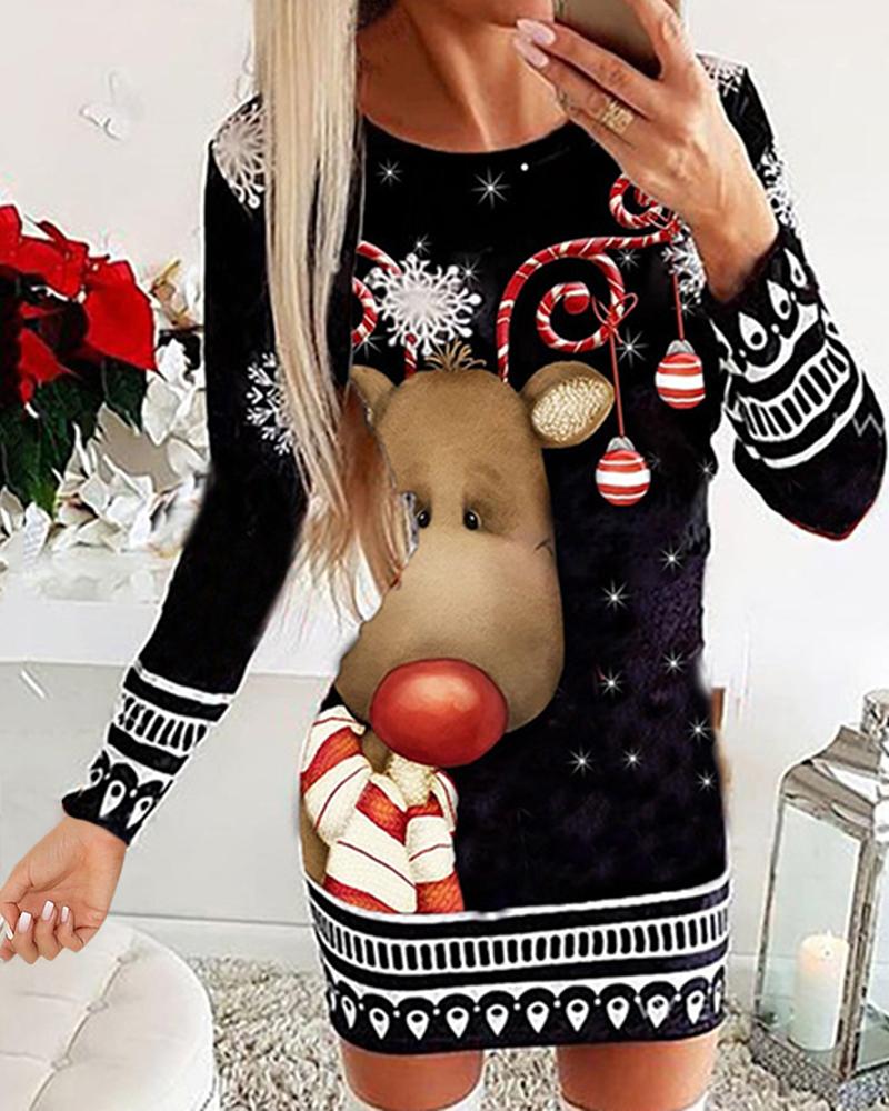 Christmas Graphic Cartoon Print Long Sleeve Bodycon Dress