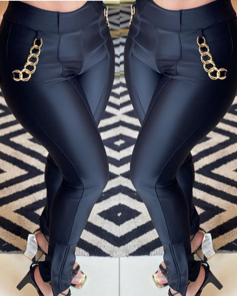 Style:Chic Type:Skinny Pants Material:PU Leather Length:Long Pattern Type:Plain Decoration:Chain Fit Type:Skinny Occasion:Daily Package Include:1*Pants