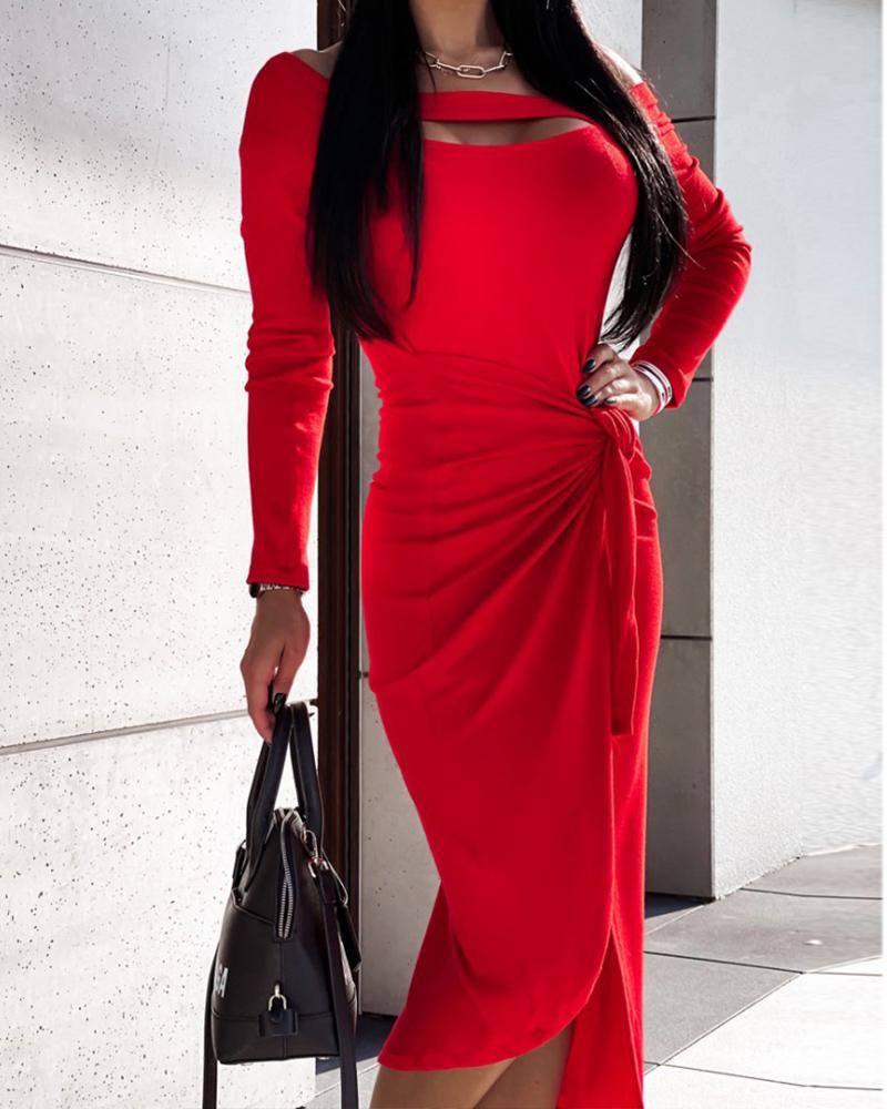 Style:Chic,Sexy Type:Slit Material:95%Polyester,5%Elastane Neckline:Off the Shoulder Sleeve Style:Long Sleeve Length:Mid-Calf Pattern Type:Plain Decoration:Cutout,Tied Detail Fit Type:Skinny Occasion:Daily Package Include:1* Dress