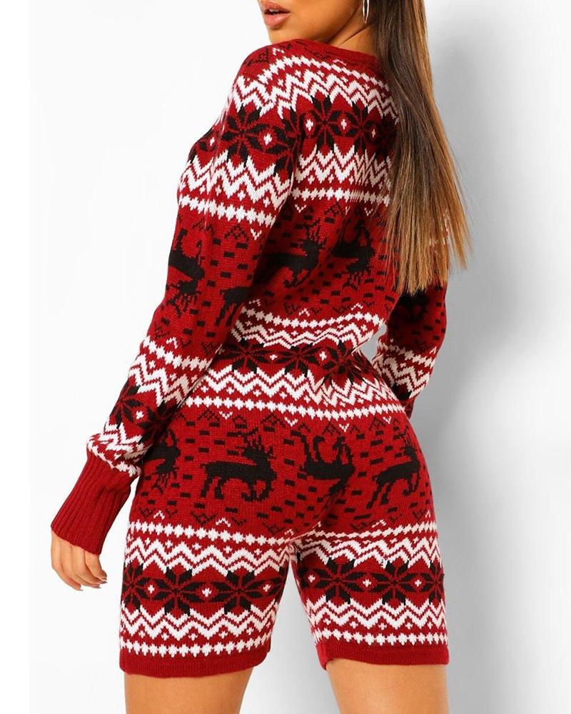 Christmas Long Sleeve Snowflake Deer Print Knit Romper