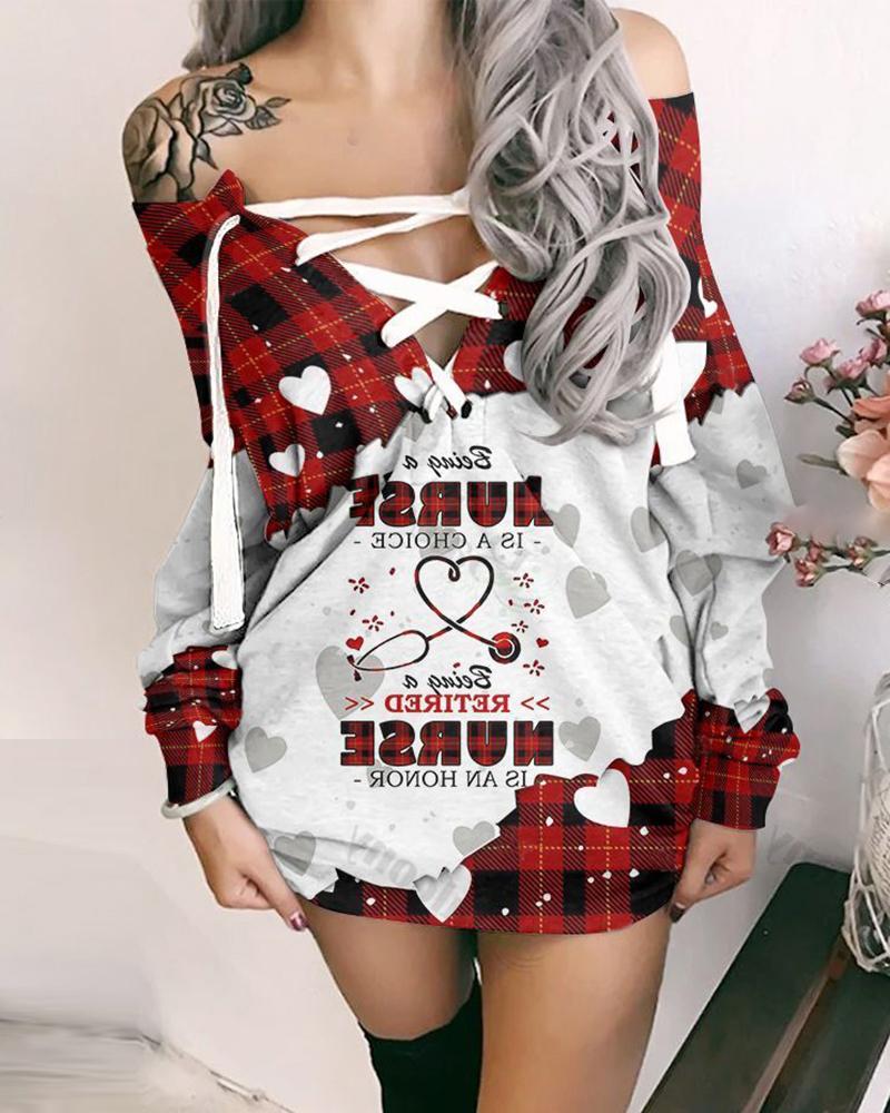 Christmas Plaid Letter Heart Print Eyelet Lace-up Sweatshirt Dress