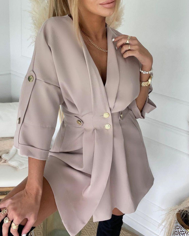 Style:Casual Type:A Line Material:Polyester Neckline:V-Neck Sleeve Style:Three Quarters Length:Mini Pattern Type:Plain Decoration:Button Fit Type:Regular Occasion:Daily Package Include:1* Dress