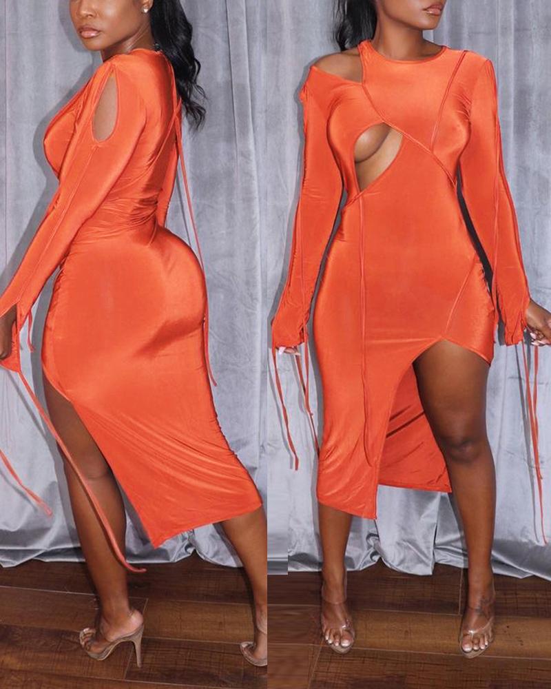 Style:Chic,Sexy Type:Bodycon Material:Polyester Neckline:Cold Shoulder Sleeve Style:Long Sleeve Length:Mid-Calf Pattern Type:Plain Decoration:Cutout Fit Type:Skinny Occasion:Daily,Night Out Package Include:1* Dress