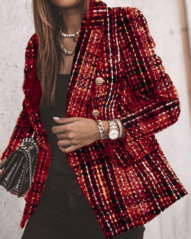 Plaid Print Lapel Collar Double Breasted Tweed Blazer