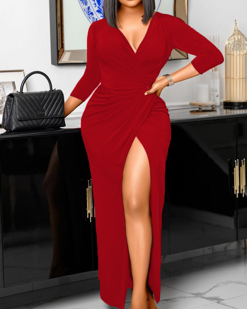 Style:Chic,Glamorous Type:Slit,Wrap Material:Polyester Neckline:V-Neck Sleeve Style:Long Sleeve Length:Maxi Pattern Type:Plain Decoration:Slit Fit Type:Regular Occasion:Party Package Include:1* Dress
