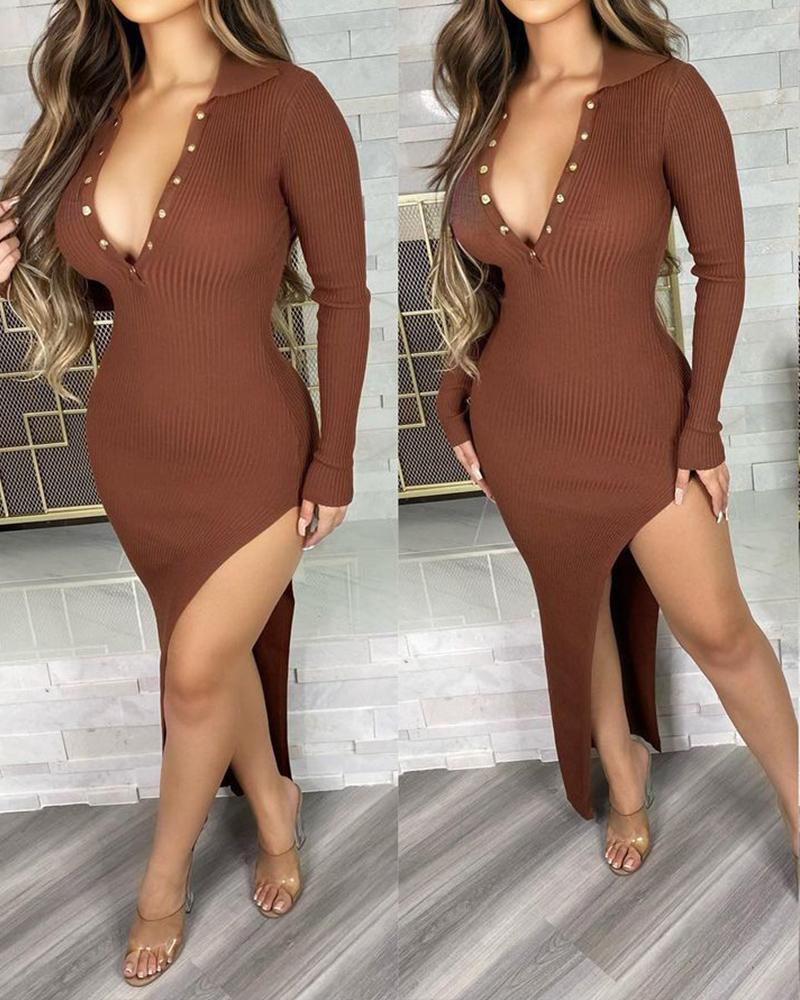 Style:Chic Type:Slit Material:Rib-Knit Neckline:Turn-down Collar Sleeve Style:Long Sleeve Length:Mid-Calf Pattern Type:Plain Decoration:Backless,Button,Slit Fit Type:Skinny Occasion:Daily Package Include:1* Dress