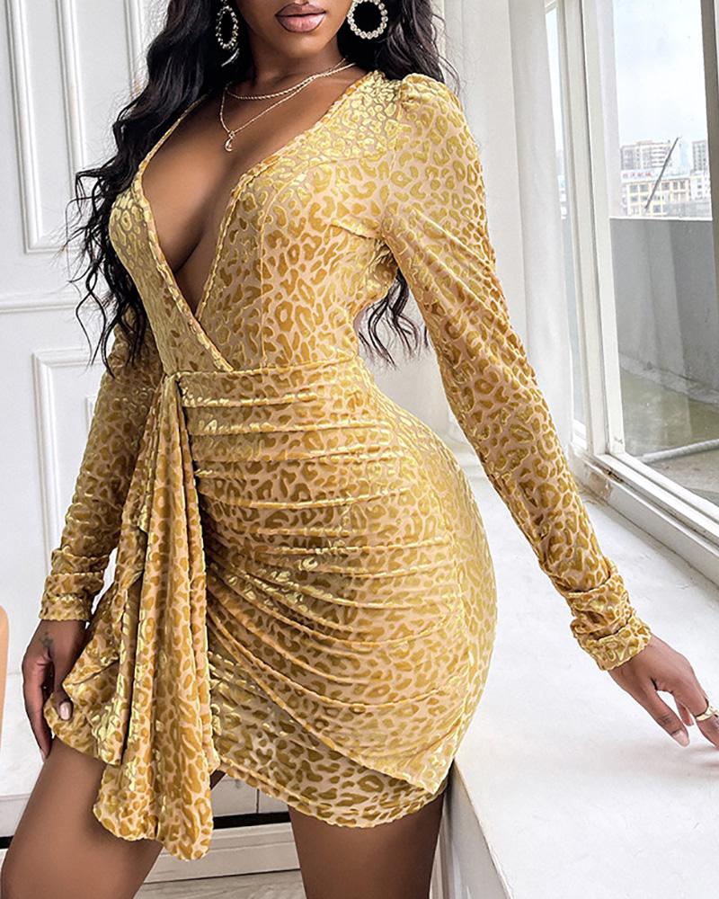 Style:Chic Type:Bodycon Material:Polyester Neckline:V-Neck Sleeve Style:Long Sleeve Length:Mini Pattern Type:Leopard Decoration:Backless Fit Type:Skinny Occasion:Party Package Include:1* Dress