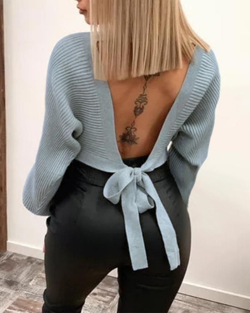 V-Neck Lantern Sleeve Knotted Backless Sweater