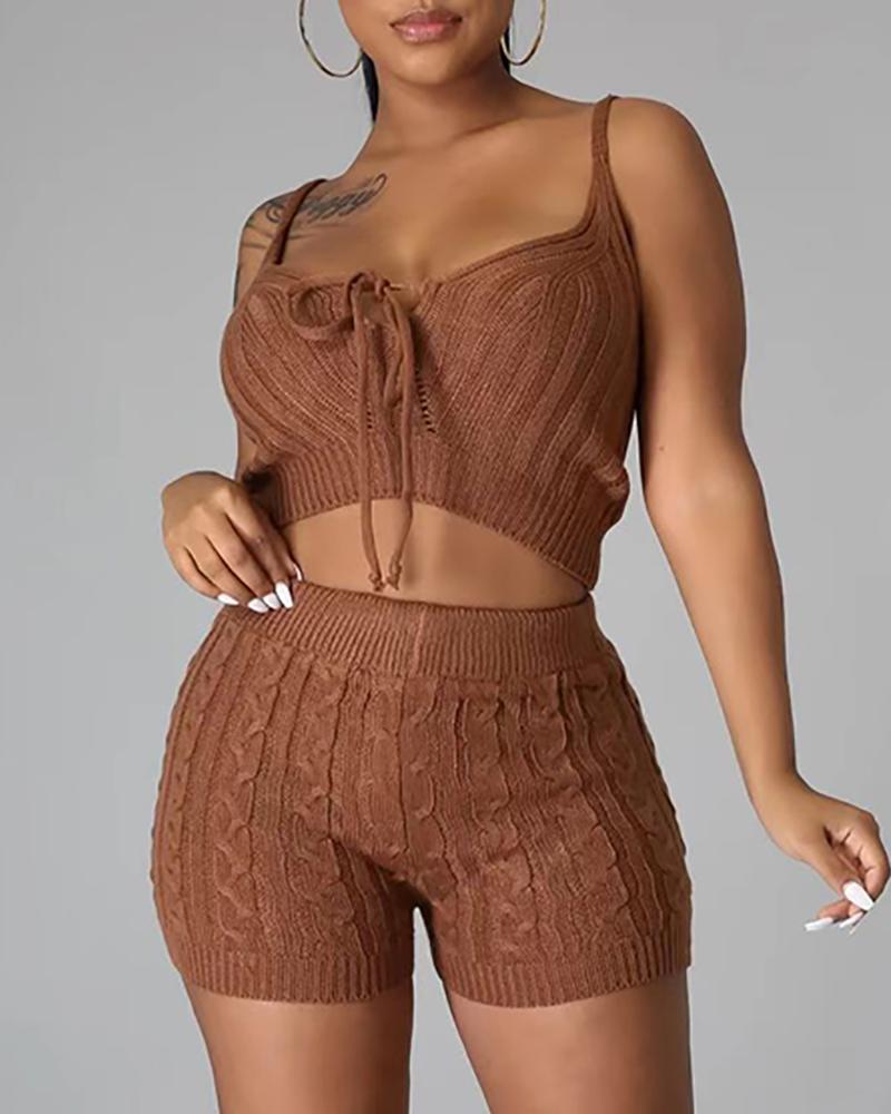 Style:Chic Type:Shorts Set Material:Rib-knit Neckline:U-Neck Sleeve Style:Sleeveless Length:Above Knee Pattern Type:Plain Decoration:Tied Detail Fit Type:Regular Occasion:Daily Package Include:Shorts Set
