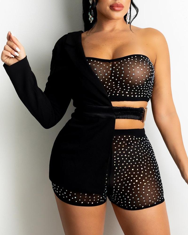 Style:Sexy Type:Shorts Set Material:95%Polyester,5%Elastane Neckline:Bandeau,One Shoulder Sleeve Style:Long Sleeve Length:Above Knee Pattern Type:Studded Decoration:Mesh Fit Type:Skinny Occasion:Night Out Package Include:Shorts Set(With Blazer Coat)