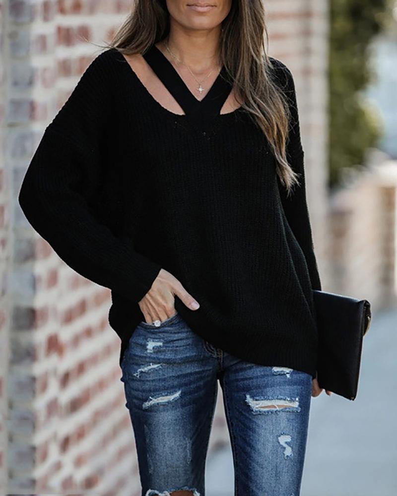 Style:Elegant Type:Sweater Material:Rib-knit Neckline:V-Neck Sleeve Style:Long Sleeve Length:Regular Pattern Type:Plain Decoration:Cutout Fit Type:Oversized Occasion:Daily Package Include:1*Sweater
