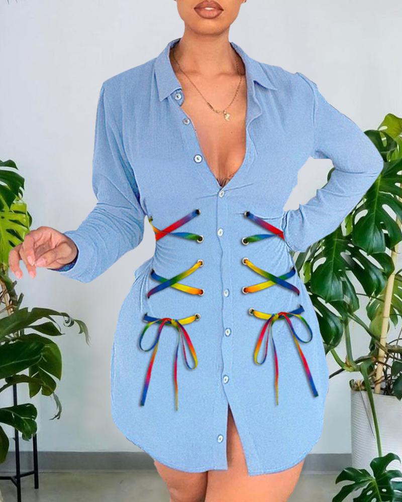 Grommet Eyelet Rainbow Lace-Up Button Front Shirt Dress