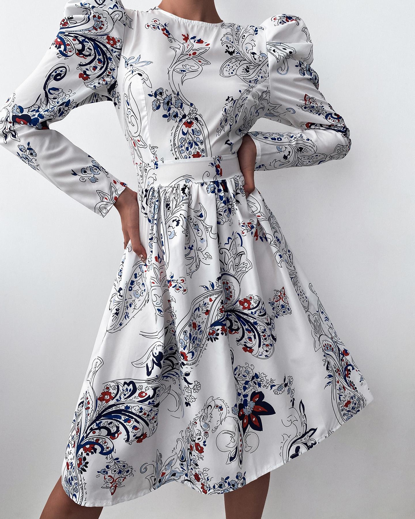 Style:Chic Type:A Line Material:Polyester Neckline:O-neck Sleeve Style:Long Sleeve,Puff Sleeve Length:Mini Pattern Type:Floral Decoration:Puff Sleeve Fit Type:Regular Occasion:Daily Package Include:1* Dress