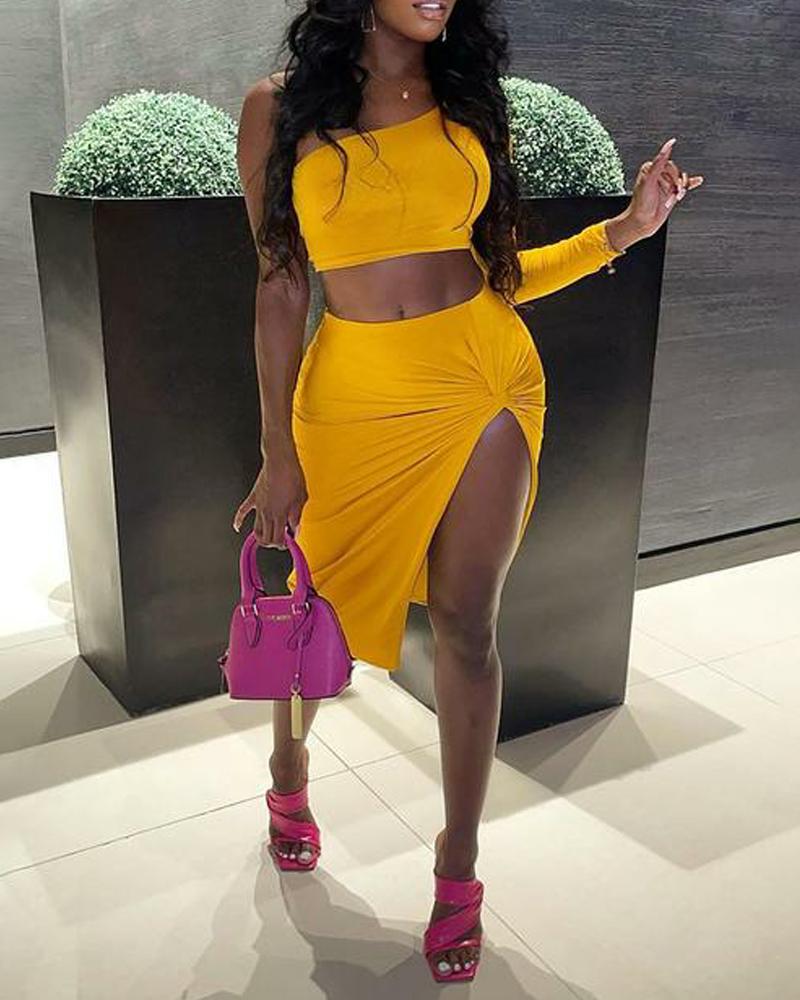 One Shoulder Crop Top & Twist Ruched Split Thigh Skirt Set