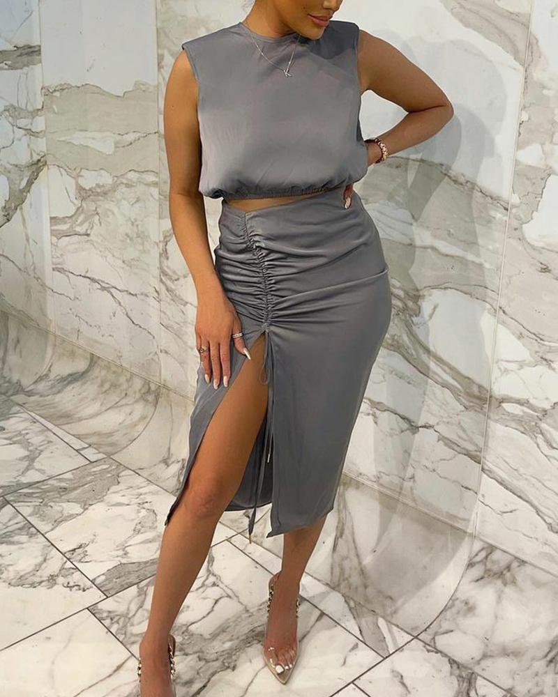 Keyhole Back Crop Tank Top & Drawstring Ruched Split Thigh Skirt Set