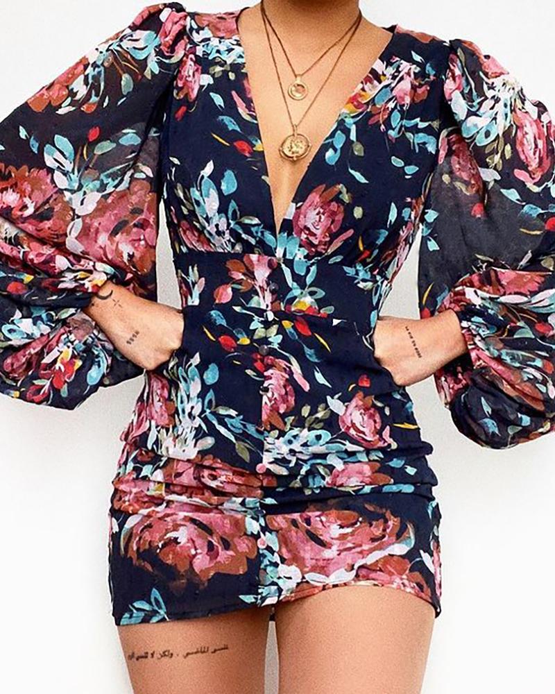 Style:Casual Type:A Line Material:Polyester Neckline:V neck Sleeve Style:Lantern Sleeve Length:Mini Pattern Type:Floral Decoration:Lantern Sleeve Fit Type:Regular Occasion:Daily Package Include:1* Dress