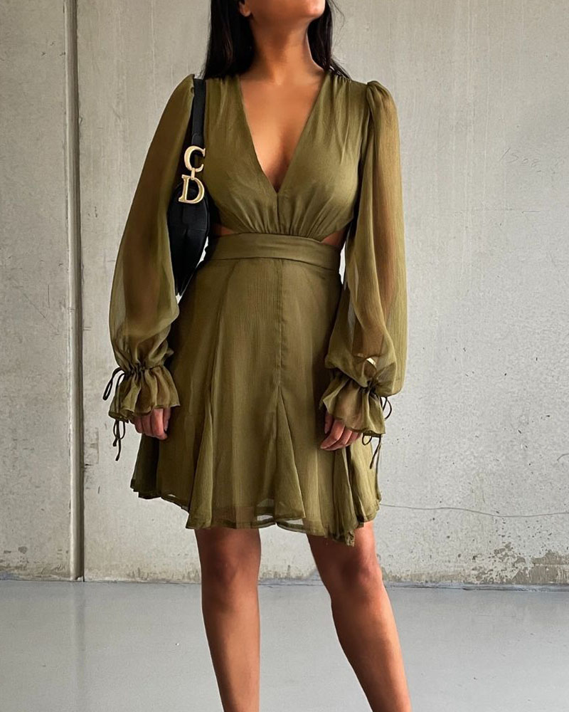 Style:Chic Type:A Line Material:100%Polyester Neckline:V-Neck Sleeve Style:Long Sleeve,Puff Sleeve Length:Mini Pattern Type:Plain Decoration:Cutout Fit Type:Regular Occasion:Daily Package Include:1* Dress