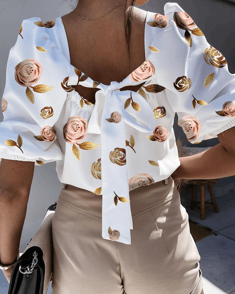 Floral Print Puff Sleeve Tie Back Blouse