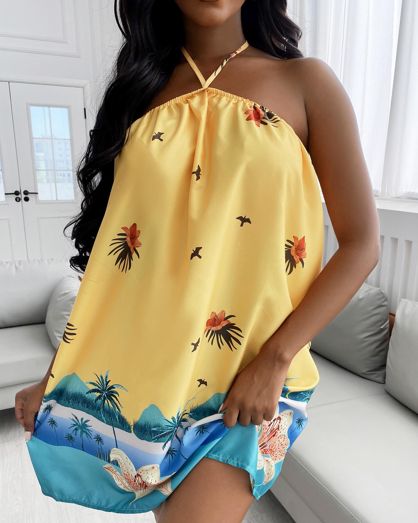 Style:Chic Type:Straight Material:95%Polyester,5%Elastane Neckline:Halter Sleeve Style:Sleeveless Length:Mini Pattern Type:Animal,Landscape,Tropical Decoration:Backless,Tied Detail Fit Type:Regular Occasion:Daily,Vacation Package Include:1*Dress Fabric Elasticity:Non-Stretch Sheer:No Care Instructions:Machine wash or professional dry clean