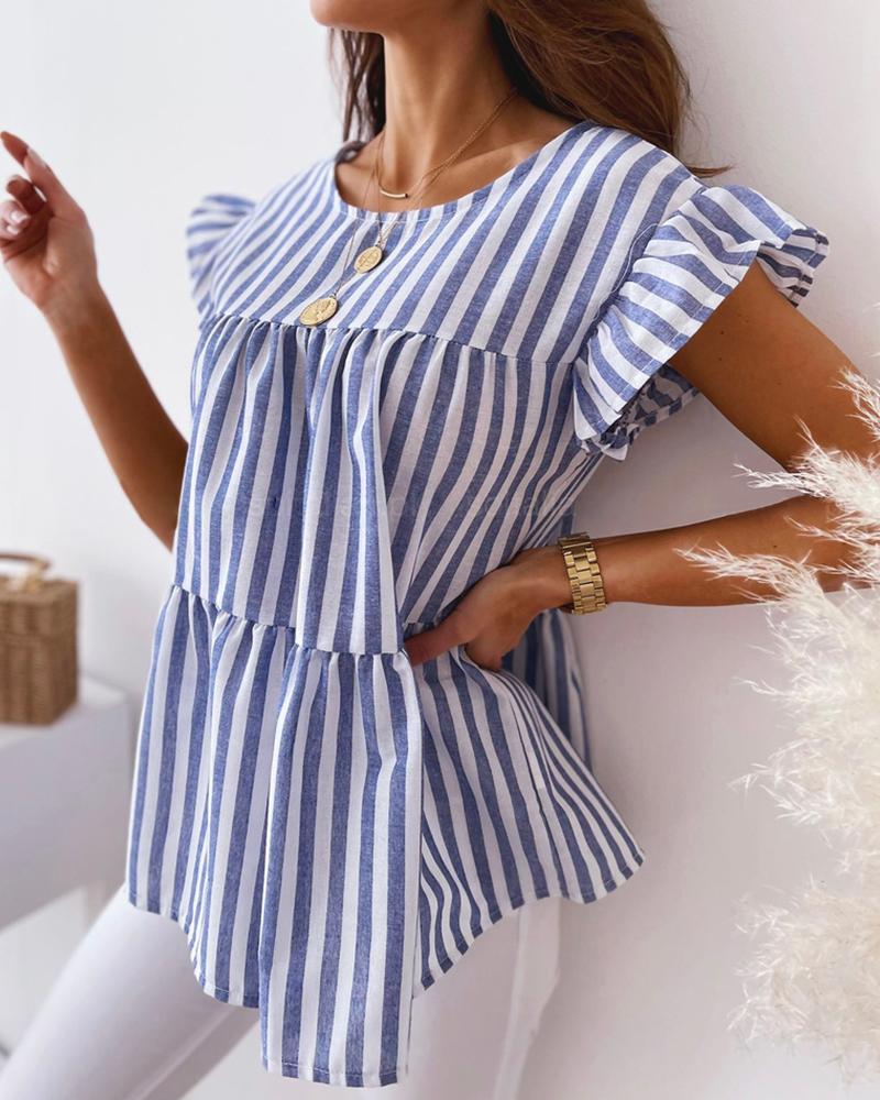 Style:Casual Type:Tee Material:Polyester Neckline:O-neck Sleeve Style:Flutter Sleeve Length:Regular Pattern Type:Striped Decoration:Flutter Sleeve Fit Type:Regular Occasion:Daily Package Include:1*T-Shirt