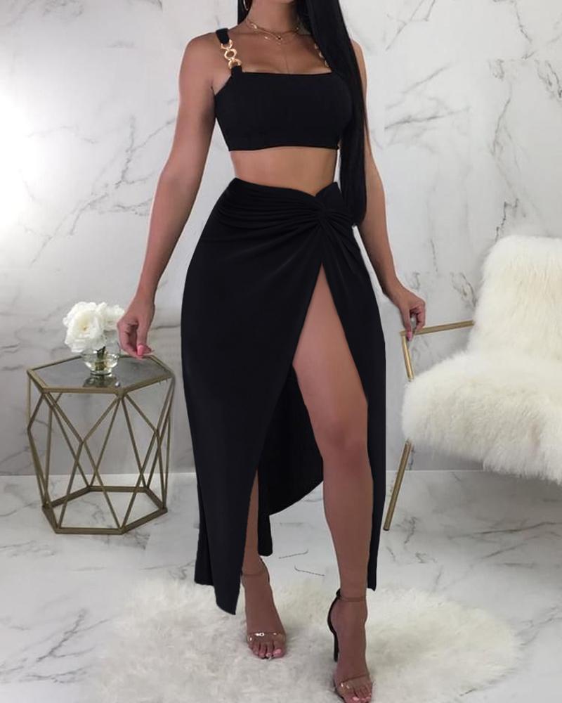 Style:Chic Type:Skirt Sets Material:Polyester Neckline:Square Neck Sleeve Style:Sleeveless Length:Maxi Pattern Type:Plain Decoration:Chain Strap,Slit Fit Type:Skinny Occasion:Daily Package Include:Skirt Set