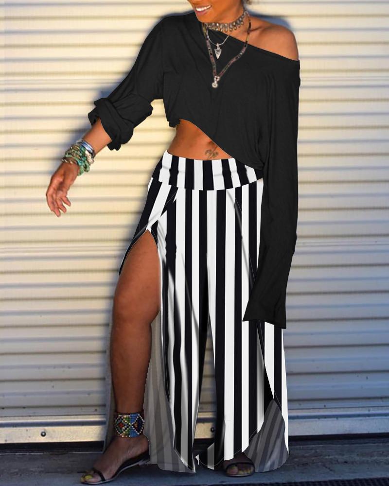 Plain Top & Striped Print Slit Pant Sets